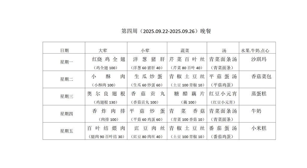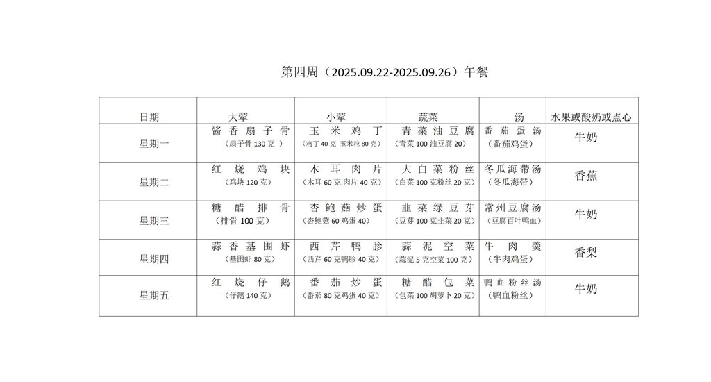 正衡中学天宁分校2025-26学年第一学期第四周菜单