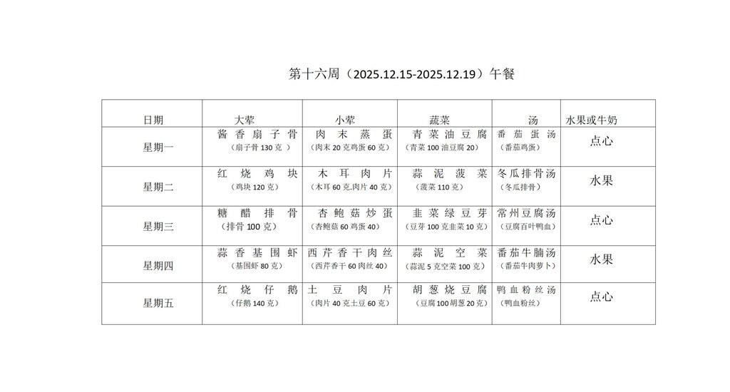 正衡中学天宁分校2025-26学年第一学期第十六周菜单